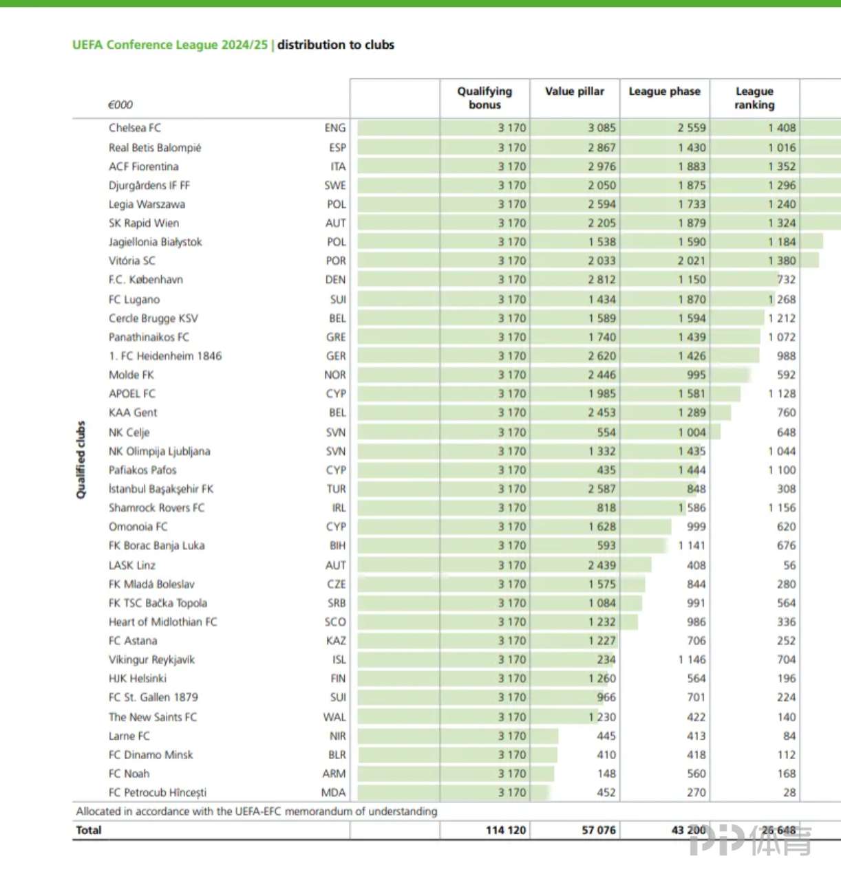 欧协联方面,冠军切尔西获得2182万欧元的奖金,亚军贝蒂斯则获得1708万,佛罗伦萨和尤尔加登则分别获得1398万与1299万的奖金。